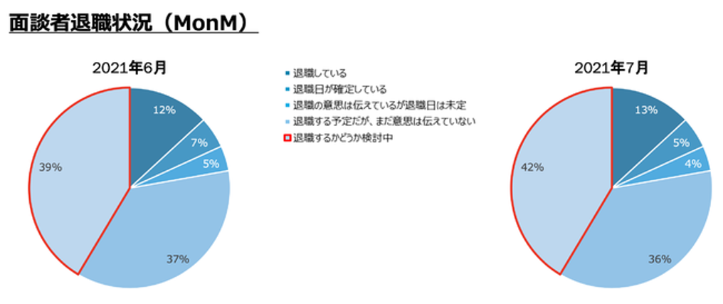 面談者の退職状況を分析した結果、6月に比べ7月は「退職するか検討中」が39%から42%へと増加しました。7月に入っても「退職している・退職が決まっている」という転職意欲が高い人材割合はほぼ横ばいの状態で、5月から引き続き求職者の腰が重い状況です。