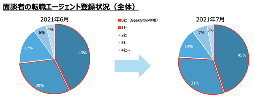 面談者の転職エージェント登録状況を分類した結果、6月に比べ7月はギークリーのみを利用している人は43%から45%に増加しました。