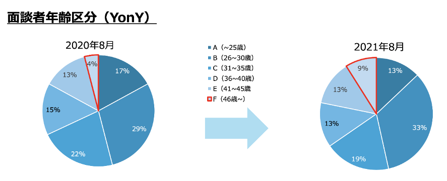 2020年8月に比べて、2021年8月は46歳以上の集客比率が4%から9%へ増加しました。経験豊富なベテラン層に対する採用ニーズが高まっており、50歳以上のエンジニアの転職決定率も伸びています。今後もギークリーでは、ベテラン層への集客に注力していきます。