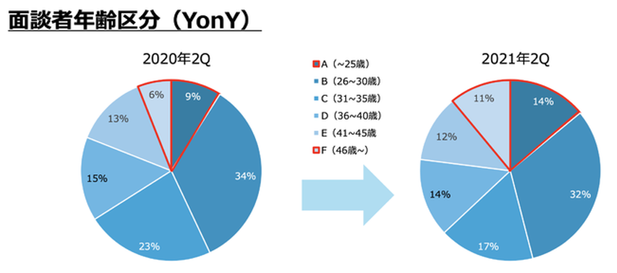 面談者を年齢別に分類した結果、2020年第2四半期に比べ、2021年第2四半期は46歳以上の占有率が5%増加しています。また、25歳以下の占有率も5%増加しました。