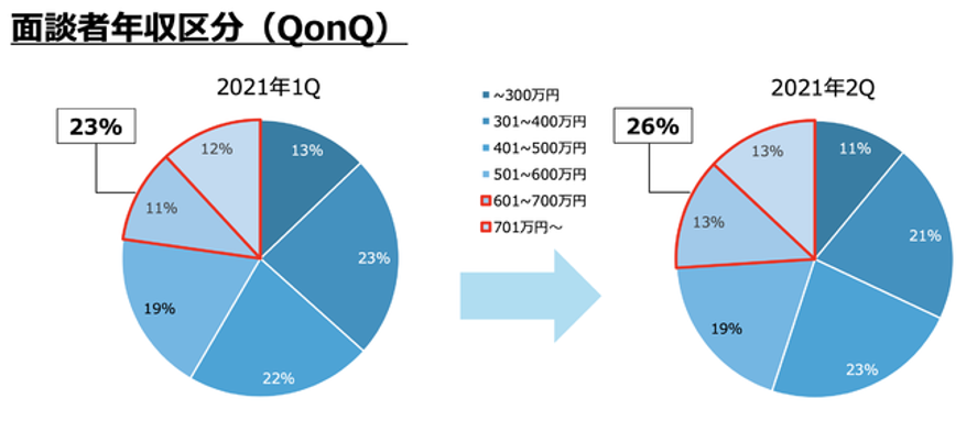 面談者を年収別に分類した結果、2021年第1四半期に比べ第2四半期は現年収600万円以上の占有率が26%へ増加しています。