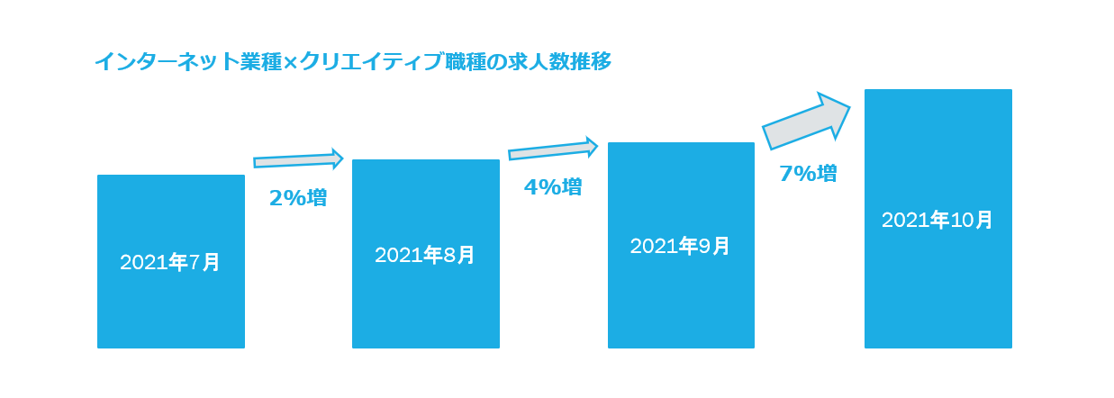 9月まで毎月求人数が2%~4%と微増し続けていたクリエイティブ職種が、10月は7%増加し急上昇の兆しが見られました。クリエイティブ職種の求人数急上昇に付随して採用要件緩和、採用ニーズの上昇も見受けられるため、今後も求人数増加の傾向が続くと考えられます。特に、ネットメディア企業はWebディレクター・デザイナー職が17%増、SaaS企業もWebデザイナー職が16%増と、インターネット業種のクリエイティブ職種ニーズが高まっております。また、顧客リード獲得を目的とした自社メディアコンテンツの充実化に動いていることからも、各社クリエイティブ職の内製化に向けた求人増加傾向にあると考えられます。