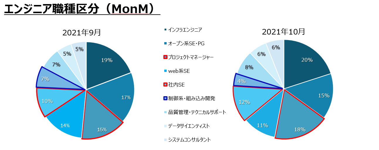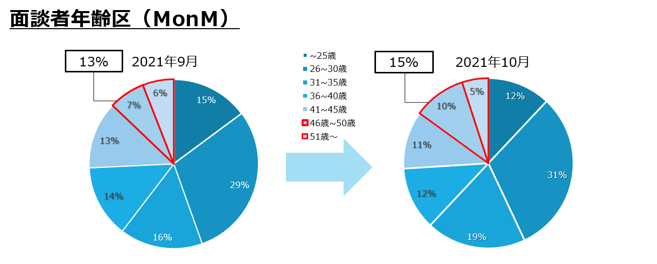 面談者を年齢別に分類した結果、2021年9月に比べ10月はプロジェクトマネージャーが3%増加、社内SEが2%増加しています。エンジニア全体のニーズが高まっているため、年齢の拡張をして集客を行っていることが要因です。また、46歳以上は転職決定率が高いため継続して集客強化をしていきます。