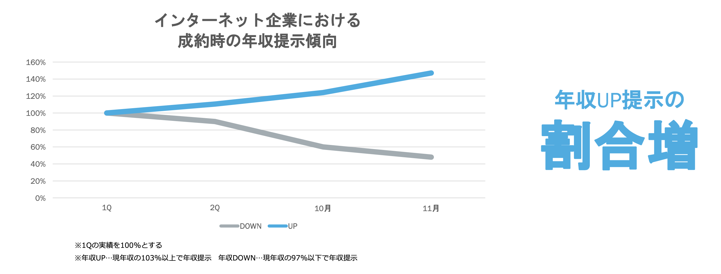 インターネット業界では採用激化に伴い、内定時に年収UPを提示する傾向が強まっています。