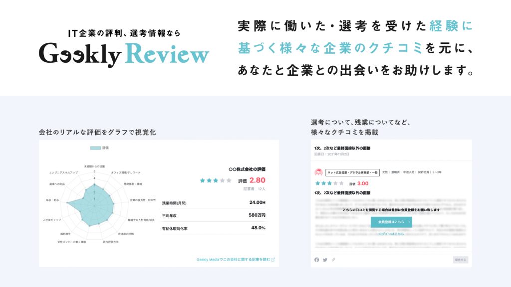 一方で、新型コロナウイルスが猛威を振るう昨今では、キャリアについて悩まれる方も増えており、既存の人材紹介事業のみでは、明確に転職をすると決めていない方々には価値提供ができていないことを感じておりました。ギークリーはそういった方々の悩みも解決すべく、この度「Geekly Review」をリリースいたします。