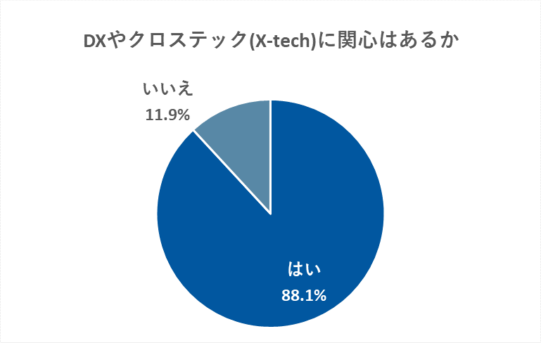 今回の調査では、DXやクロステックに関心のある方は全体の約9割という結果になりました。