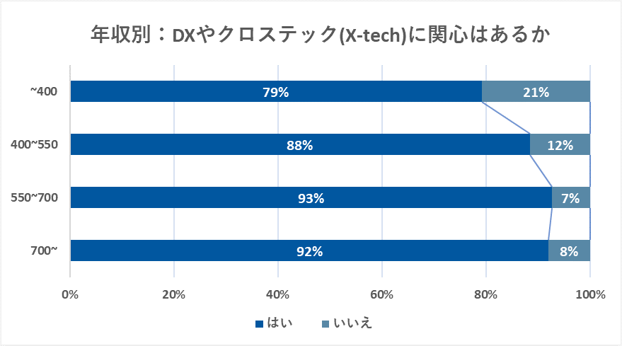 年収が高い方ほどDXやクロステックへの関心が高い結果となっており、550万円を超えると9割を超える方が関心を示しています。 年収が高い方は社会の動向や最新の技術情報に対して敏感であるといえるでしょう。