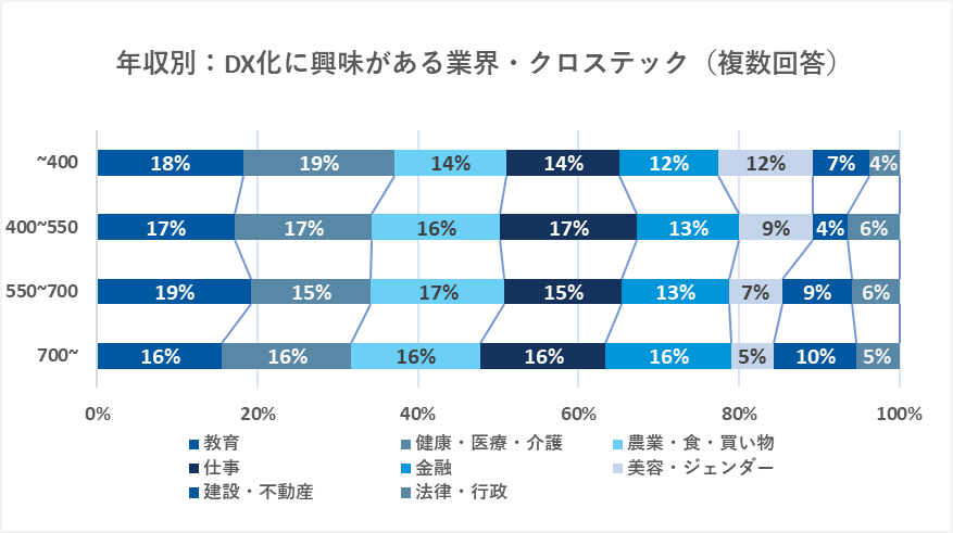 ただそのなかでも、年収が高い方については「金融(フィンテック)」や「建設・不動産(コンテック・不動産テック)」への関心が、他の年収帯と比較すると高い結果となっています。