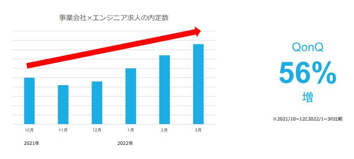 2022年1月、2月に引き続き、3月もIT企業ではない事業会社のエンジニアの採用において内定数が増加しました。2021年10〜12月と2022年1〜3月の3ヶ月間(四半期単位)で比較したところ、56%増と一気に内定数が加速しています。
