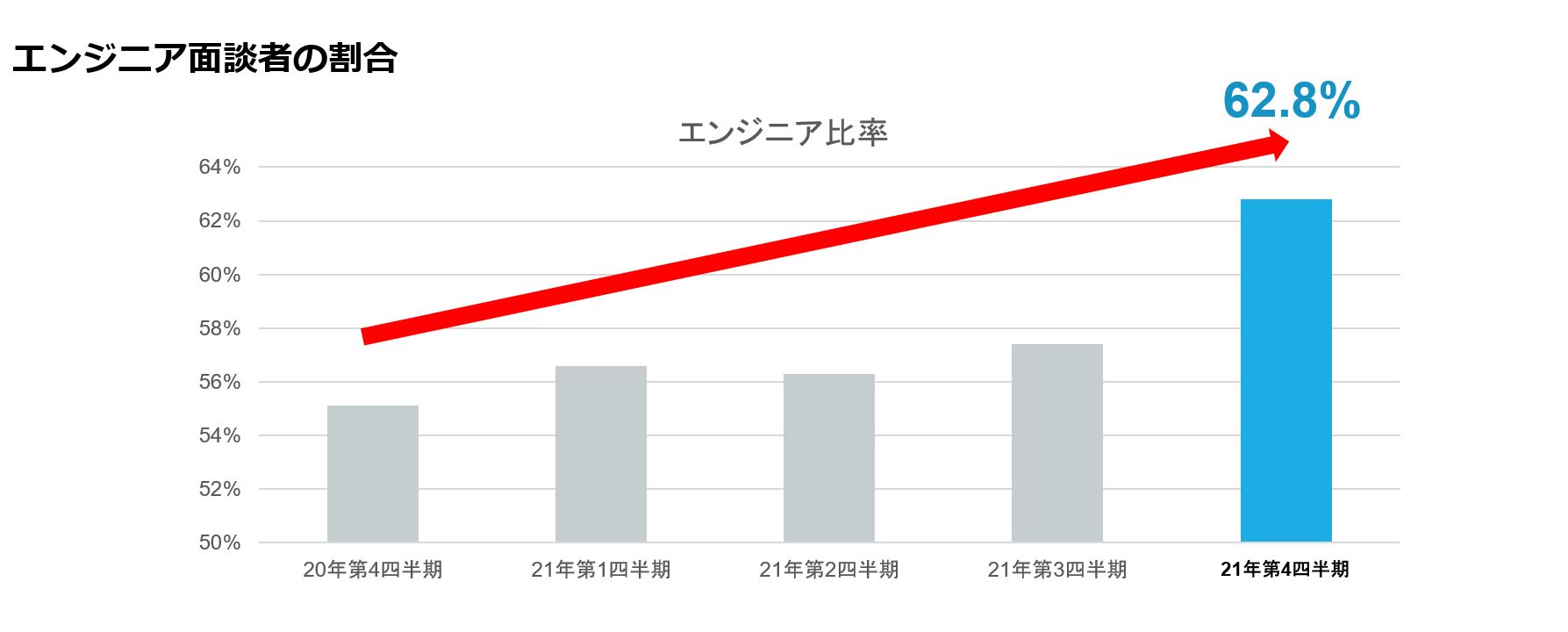 ギークリーが実施した面談においてエンジニアが占める割合を四半期単位で比較した結果、2021年第4四半期は62.8%と過去最高の割合を記録しました。求人企業からの需要の高さを鑑み、第二新卒や高年齢層まで集客範囲を拡大したことにより、エンジニア比率の増加につながりました。