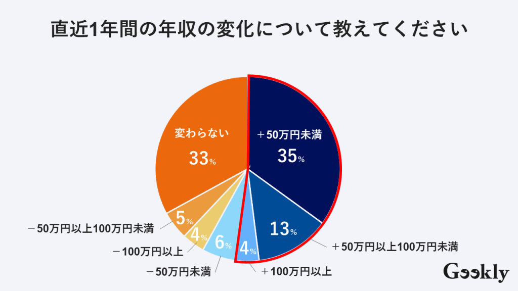 アンケートに答えた半数以上の方は、直近1年間の年収がアップしていた